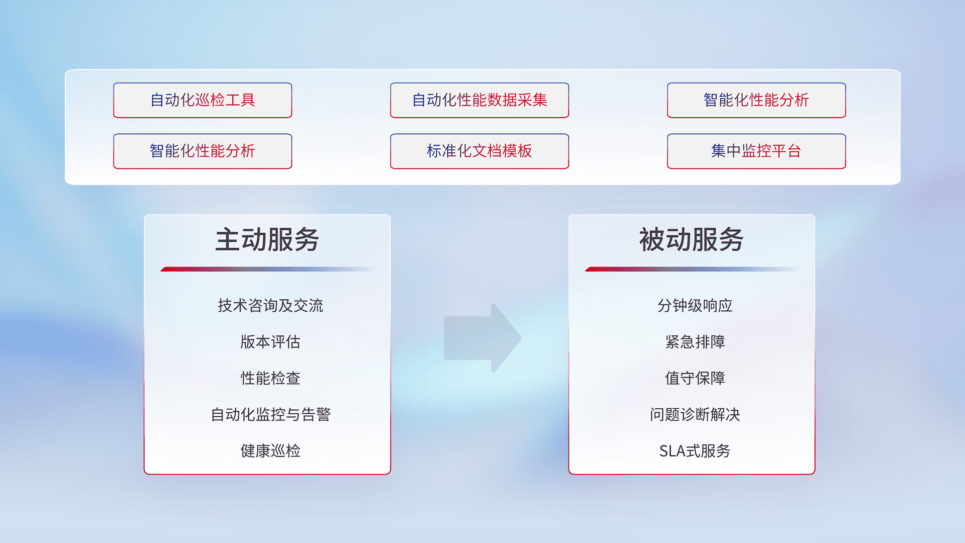 智能化工具和标准化文档,,,,保障服务质量,,,提供主动服务(包含技术咨询、、版本评估、、性能检查、、自动化监控与告警、、、、健康巡检)和被动服务包含(分钟级响应、、、紧急排障、、值守保障、、问题诊断解决、、、SLA服务)。。。。